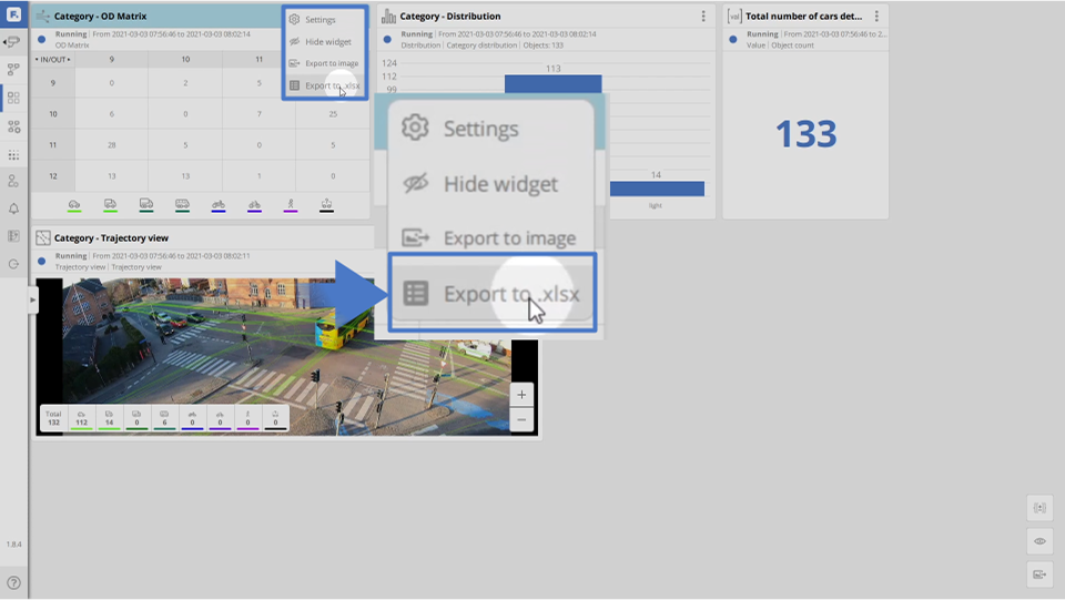 We can export an excel spreadsheet of the OD Matrix/table by clicking on the 3 dots in the top right corner of the widget in the dashboard and select export to .xlsx.
